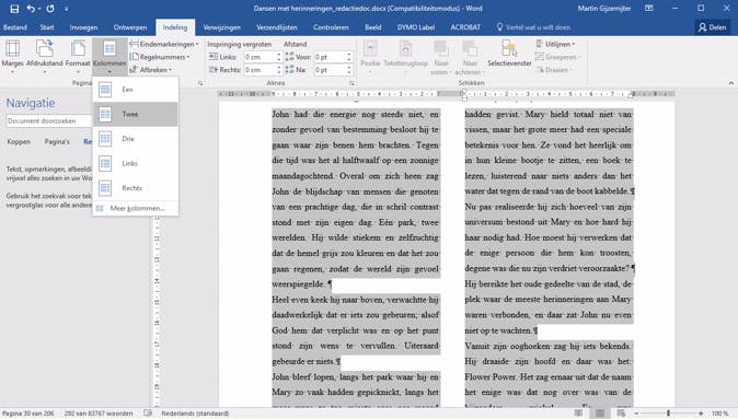 Deze functie wordt door veel mensen vermeden omdat hij zo ingewikkeld lijkt. Dat is zonde, want het is een fantastische tool om je document wat fraaier op te maken. En de werking is eigenlijk heel eenvoudig, als je hem doorhebt. Typ eerst gewoon de tekst die je wilt typen. Selecteer deze tekst vervolgens en klik in het tabblad Indeling in het lint bij Pagina-instelling op de knop Kolommen. Standaard is er (uiteraard) één kolom geselecteerd, maar je kunt dus ook gaan voor twee of drie, een brede rechterkolom met een smalle linker enzovoort. Twijfel je hoe je document nu in elkaar zit? Lees dan stap 8 nog een keertje, want met de verborgen tekens kun je prima zien waar kolommen beginnen en eindigen.