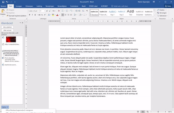 Maak jij veel gebruik van kopiëren en plakken als je in Word aan het werk bent? Dan herken je ongetwijfeld de situatie waarin je per ongeluk tussendoor even snel iets anders hebt gekopieerd, waardoor je helemaal niet in je document plakt wat je wilde plakken. Wist je al dat er, naast het gewone klembord in Windows, ook nog een klembord in Word zit ingebouwd met vrijwel onbeperkte opslagcapaciteit? Je vindt dit klembord door onder het tabblad Start in het lint te klikken op het kleine vierkantje met pijltje naast Klembord. Het klembordpaneel opent nu en je ziet daarin alles dat je gekopieerd hebt sinds je Word (deze sessie) hebt gestart. Het mooie is dat hierin niet alleen wordt opgeslagen wat je in Word kopieerde, maar ook in bijvoorbeeld je browser. Wanneer je klikt op één van de onderdelen in het paneel, wordt dit automatisch ingevoegd op de plek waar de muisaanwijzer staat.