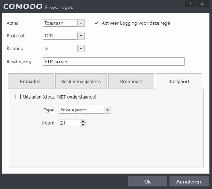 03 Een voorbeeld van een firewallregel, waarbij we in dit geval verkeer op poort 21, ftp dus, expliciet toestaan.