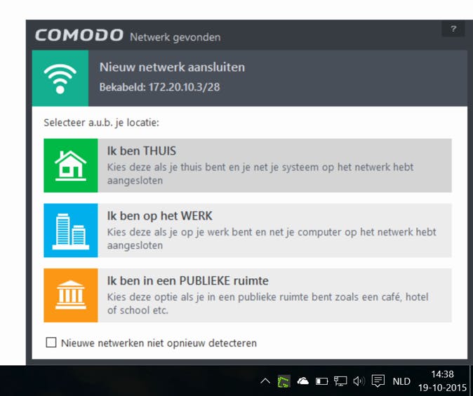 Het eerste wat Comodo na het opnieuw opstarten vraagt, is om je huidige locatie te kiezen: thuis, op het werk of in een publieke ruimte. In ons geval zijn we thuis aan het werk, dus kiezen we voor de optie met het huis. Elke keer als je verbinding maakt met een nieuw netwerk, zal Comodo deze vraag stellen. Het onderscheid hiertussen is belangrijk: als je thuis bent, ben je over het algemeen in een veiligere omgeving dan op het werk en al helemaal dan in een publieke ruimte. Hierdoor kan Comodo goed bepalen of het bijvoorbeeld mediaverkeer zal toelaten. In het venster van de bedankmelding, kun je rechtsonder kiezen voor Dit venster niet opnieuw tonen.