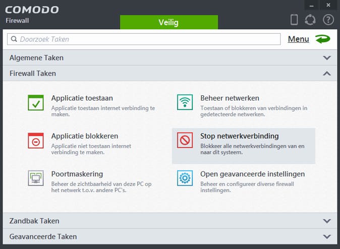 Comodo heeft een firewall killswitch: deze kan per direct al het netwerkverkeer van en naar je computer blokkeren. Dat is handig op het moment dat je bijvoorbeeld bent geïnfecteerd, om te voorkomen dat er andere malware binnenkomt of dat er gegevens weglekken. Om deze killswitch in te schakelen, open je de Comodo-interface en ga je rechtsboven naar Taken / Geavanceerde Instellingen / Firewall Taken. Kies hier voor Stop netwerkverbinding. Comodo blokkeert direct al het netwerkverkeer, zodat er niets meer in of uit kan. Je kunt vervolgens op Herstel netwerkverbinding klikken om de internetverbinding weer actief te maken als je eenmaal de infectie het hoofd hebt geboden.