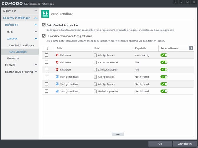 Zoals we net al lieten zien, controleert Comodo elk proces op of het vertrouwd is of niet. Comodo heeft beide functies samengevoegd, waarmee het mogelijk wordt automatisch niet-vertrouwde programma's in de sandbox uit te voeren, dat is de zogenaamde Auto-Zandbakfunctie. Je kunt deze inschakelen door naar het hoofdscherm te gaan en bij Auto-Zandbak op Uitgeschakeld te klikken en daarna voor Ingeschakeld te kiezen. Je kunt hem verder configureren door op Auto-Zandbak te klikken. Standaard worden nu niet-herkende applicaties in de zandbak geplaatst. Je kunt toepassingen handmatig altijd in de sandbox laten starten door onderaan op het pijltje te klikken en voor Toevoegen te kiezen. Vervolgens kun je bij Doel achteraan op Selecteren klikken en kiezen om een bestand of gestart proces in de zandbak uit te voeren. Klik ten slotte op OK om de regel op te slaan en toe te passen.