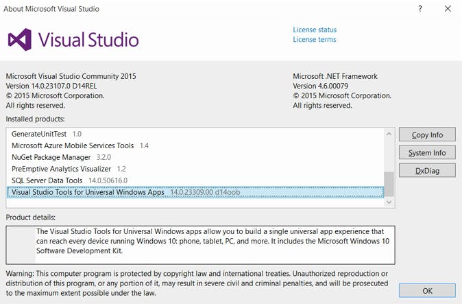 We gaan ervan uit dat je Windows 10 op je computer hebt staan. Verifieer of je minstens de publieke release hebt draaien. Als je winver in het startmenu typt en op Enter drukt, moet het infovenster minstens build 10240 vermelden. Is dat in orde, installeer dan Visual Studio Community 2015. Kies als installatietype Custom, vink Universal Windows App Development Tools / Tools and Windows SDK aan en klik op Install. De installatie duurt overigens wel een tijdje, want er worden meerdere gigabytes gedownload en geïnstalleerd.