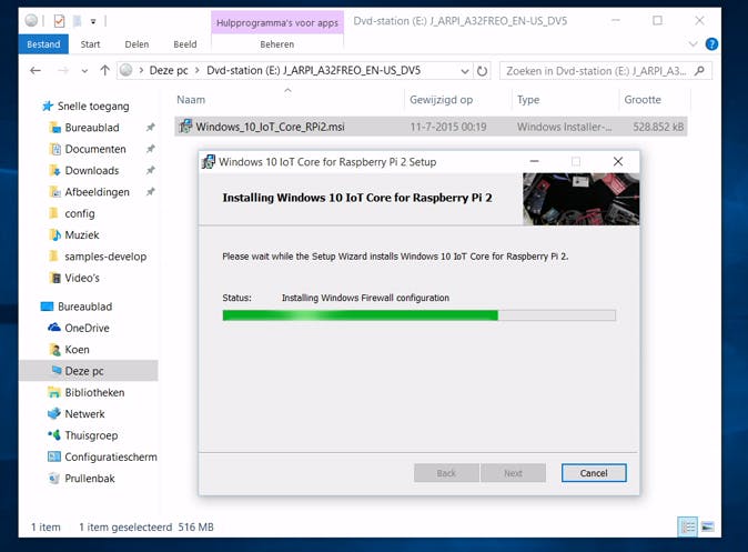 Nu onze computer klaar is, is het tijd om onze Raspberry Pi 2 te prepareren. Download daarvoor eerst het iso-bestand van Windows 10 IoT Core voor de Raspberry Pi 2. Open het iso-bestand, zodat het zichzelf als een virtuele schijf aankoppelt. Open de schijf en dubbelklik op het bestand Windows_10_IoT_Core_RPi2.msi om het te installeren. Na de installatie vind je een bestand flash.ffu in de directory C:\Program Files (x86)\Microsoft IoT\FFU\RaspberryPi2. Je kunt nu de virtuele schijf van het iso-bestand 'uitwerpen'.