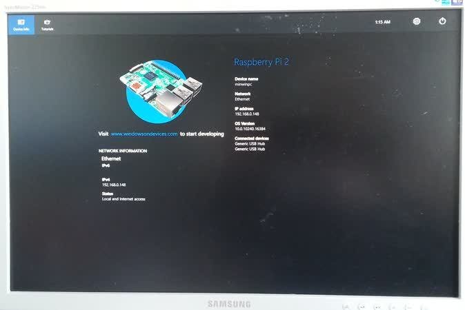 Steek de microSD-kaart met Windows 10 IoT Core in het kaartslot van de Raspberry Pi 2. Verbind het computertje via een ethernetkabel met hetzelfde lokale netwerk als je computer. Sluit een toetsenbord, muis en HDMI-monitor aan en steek daarna de voedingskabel in je Pi en in het stopcontact. Windows 10 IoT Core start nu op. Na enkele minuten krijg je op je scherm een standaardapp te zien die wat informatie over de netwerkverbinding van je Raspberry Pi 2 en aangesloten usb-apparaten toont.
