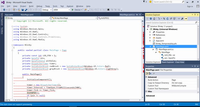 Download de broncode van alle voorbeeldapps van Microsoft en pak het zip-bestand uit. Ga in de verkenner naar de map samples-develop\Blinky\CS en open het bestand Blinky.csproj. Visual Studio wordt nu geopend en toont je rechts alle onderdelen van het project. Dubbelklik op een bestand om de inhoud ervan te bekijken. De xaml-bestanden bevatten de xml-code die de interface beschrijft, terwijl de xaml.cs-bestanden de C#-code bevatten die het gedrag van de app definieert.