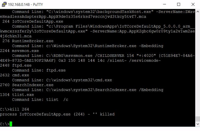 Windows 10 IoT Core start net zoals de desktopversie van Windows allerlei services op de achtergrond. Met de opdracht net start krijg je een lijst te zien van alle services die momenteel draaien. Met net stop servicenaam stop je een service en met net start servicenaam start je die opnieuw. Je Pi uitschakelen gaat overigens met shutdown /s /t 0 en rebooten met shutdown /r /t 0. Of als je een muis en scherm op je Pi hebt aangesloten, klik je bovenaan rechts op het powericoontje.