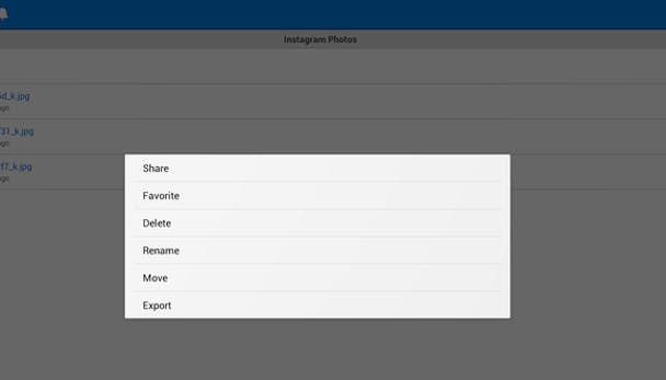 Ga naar je Instagram Foto's-map, en zoek naar de foto's die je wilt gebruiken. Houd de naam van de foto ingedrukt, en selecteer Export in het menu dat verschijnt. Kies er nu voor om de foto op de SD-kaart op te slaan.