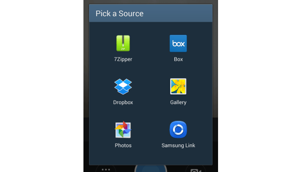 In Android, druk op de knop die op een boter-kaas-en-eieren raster van negen vierkanten lijkt. Als je een recente versie van Android hebt, krijg je een optie te zien waarmee je kunt kiezen waar je naar je foto's wilt zoeken. Er zou een Dropbox optie bij moeten staan.