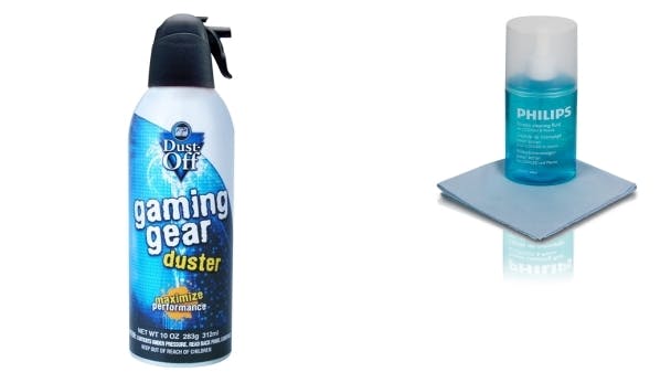 Met een spuitbus met perslucht kun je het stof wegblazen.