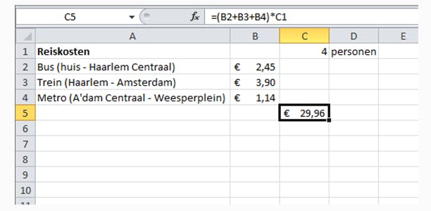 Met deze formule kunnen we de reiskosten voor vier personen berekenen.