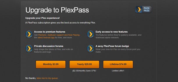 Om te beginnen moeten we Plex Media Server op de computer installeren. Je downloadt het gratis programma hier, waarbij je onder meer kunt kiezen voor een Windows, Mac OS X en Linux-versie. Wij gaan in dit geval aan de slag met de Windows-software. Terwijl het kleine programma aan het downloaden is, kan je jezelf alvast registreren via myPlex. Wanneer je gevraagd wordt om te upgraden naar PlexPass, negeer je dit eenvoudig door op take me to my queue te klikken.