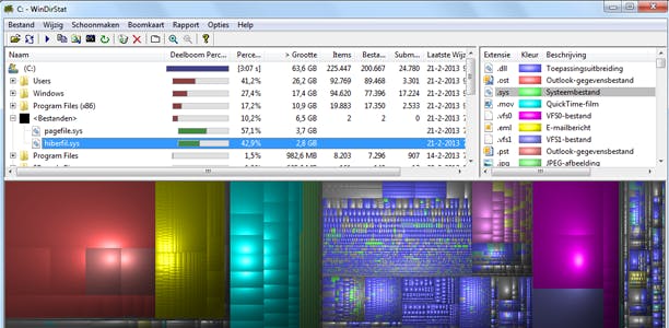 WinDirStat visualiseert de gebruikte ruimte op de schijf, zodat je in een oogopslag kan zien waar de grootste bestanden zich bevinden.