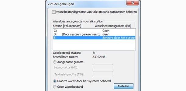 Start Uitvoeren, typ SystemPropertiesAdvanced.exe en druk op OK. Ga naar het tabblad Geavanceerd en kies in het vak Prestaties voor Instellingen. Open ook in dit venster het tabblad Geavanceerd en klik in het vak Virtueel geheugen op de knop Wijzigen. Schakel bovenin het selectievakje uit. Selecteer een schijf met voldoende opslagruimte, kies Grootte wordt door het systeem beheerd en klik op de knop Instellen. Selecteer vervolgens het SSD-station, kies Geen wisselbestand en druk op Instellen.