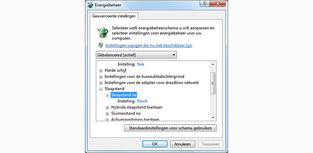 Start Uitvoeren, typ powercfg.cpl en druk op OK. Klik achter je gekozen voorkeursschema op De schema-instellingen wijzigen. Kies nu voor Geavanceerde energie-instellingen wijzigen en druk op het plusjes voor Slaapstand en het plusje voor Slaapstand na. Zet de Instelling (minuten) op 0 en druk op OK. Herstart de computer en het bestand hiberfil.sys is weg. Je kan nu de computer niet meer in slaapstand brengen.