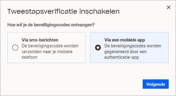 Druk op Volgende en tik de ontvangen controlecode in. Bevestig met Aanzetten. In het volgende scherm krijg je een overzicht van de beschikbare, tweede verificatiestappen.