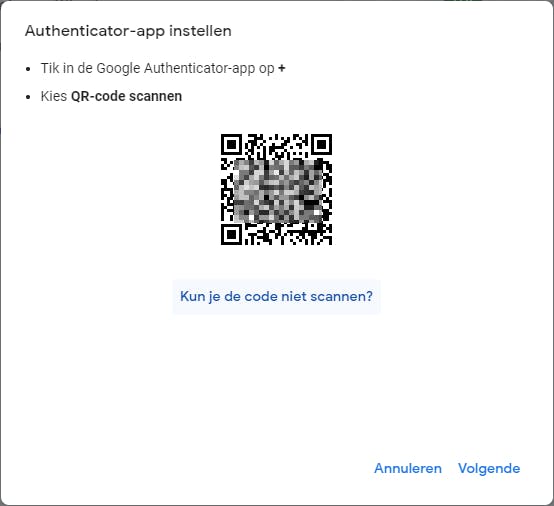 Klik nu op het pijlknopje bij Authenticator-app en op + Authenticator instellen. Er verschijnt een venster met een QR-code. Deze scan je met je Google Authenticator-app (via de optie QR-code scannen). Lukt het om een of andere reden niet, klik dan in je browser op Kun je de code niet scannen? zodat er een instelsleutel verschijnt. Deze kun je handmatig intikken in je app (via Instelsleutel invoeren).
