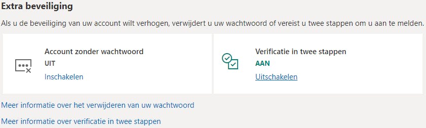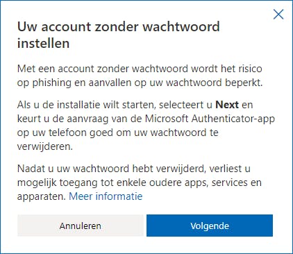 Het is eveneens mogelijk ‘wachtwoordloos’ te werken met je Microsoft-account. Je wordt dan niet langer om een wachtwoord gevraagd, maar je moet je aanmelden met een alternatieve methode, zoals een beveiligingstoken, biometrie of de Microsoft Authenticator-app. Deze laatste moet in elk geval geïnstalleerd zijn. Meld je vervolgens aan bij https://kwikr.nl/acwwloos en klik op Inschakelen bij Account zonder wachtwoord.