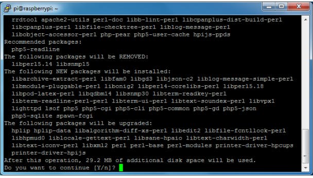 Om Selfoss te gebruiken, moeten we eerst wat andere software installeren. Allereerst een webserver, want Selfoss is een webgebaseerde dienst. We installeren lighttpd, dit is een lichtgewicht webserver. We hebben ook PHP nodig (daarin is Selfoss geschreven), samen met enkele specifieke PHP-pakketjes. Dat alles kan in één keer met de volgende opdracht nadat je in een PuTTY-venster op je Raspberry Pi ingelogd bent: sudo apt-get install lighttpd php5 php5-cgi php5-cli php5-sqlite php5-gd. Bevestig de installatie met een druk op Y.
