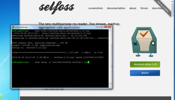 Op de Selfoss-site staat een groen downloadknopje. Kopieer de link erachter naar het klembord, open een PuTTY-venster naar je Raspberry Pi en typ wget, een spatie, en plak de link door in het PuTTY-venster te rechtsklikken. Druk op Enter waarna het zipbestand van Selfoss op je Raspberry Pi gedownload wordt. Pak het zipbestand uit met sudo unzip -d /var/www/selfoss selfoss-*.zip. Met sudo chown -R www-data:www-data /var/www/selfoss/ geven we de webserver toegang tot de directory.