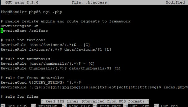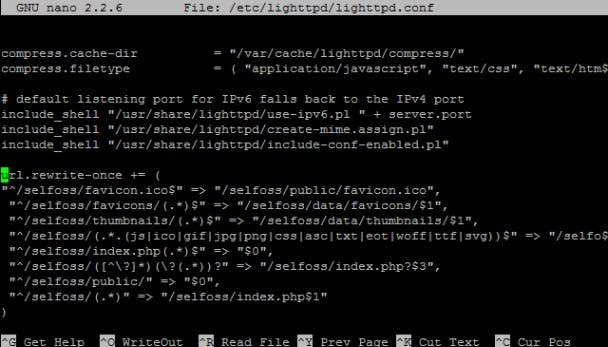 Selfoss is voor zijn werking afhankelijk van de mogelijkheid van de webserver om urls te herschrijven. Daarom moeten we nog het een en ander aanpassen in de configuratie van lighttpd. Op de wiki van Selfoss vind je instructies over de lange herschrijfregels. Voer de opdracht sudo nano /etc/lighttpd/lighttpd.conf uit, haal het hekje weg voor de regel met mod_rewrite onder de sectie server.modules en voeg op het einde van het bestand de code uit de wiki toe. Sla je wijzigingen op met Ctrl+O en sluit Nano af met Ctrl+X.