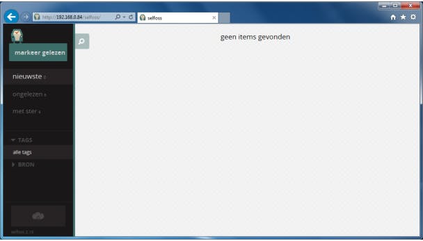 Surf nu in je browser naar http://IP/selfoss, waarbij IP het IP-adres van je Raspberry Pi is. Dat kan even duren en wellicht krijg je een timeoutmelding, maar dat is enkel de eerste keer omdat Selfoss allerlei zaken moet klaarzetten. Als alles goed gaat, krijg je daarna een webpagina te zien met de melding geen items gevonden en links een aantal menuonderdelen, waaronder markeer gelezen, nieuwste, TAGS en BRON. Het ziet er allemaal wat leeg uit, maar daar gaan we snel iets aan doen door feeds toe te voegen.