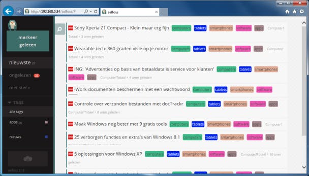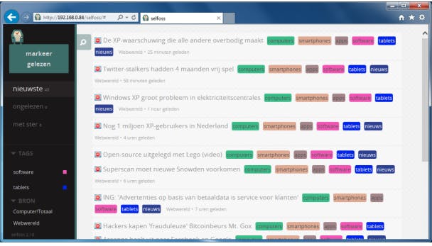 Links in de interface van Selfoss krijg je een balk te zien waarmee je door je feeds navigeert. Je kunt de nieuwste feeds opvragen, de ongelezen feeds of degene die je een ster gegeven hebt (een soort favorieten). Feeds zijn ook te filteren op tags. Als je aan elke feed een of meerdere tags toegekend hebt tijdens het toevoegen, kun je zo snel bijvoorbeeld enkel het nieuws lezen of enkel berichten over computers. Wanneer je één specifieke feed wilt bekijken, dan kan dat ook nog door onder BRON de gewenste feed te kiezen.