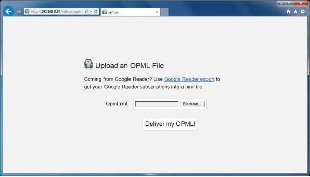 Heb je in een andere feedreader een lijst met feeds die je in Selfoss wilt gebruiken, dan is dat perfect mogelijk. Exporteer eerst je lijst met feeds in je andere feedreader naar een opml-bestand (Outline Processor Markup Language). Klik dan in de interface van Selfoss onderaan op de wolk met de pijl en dan op of importeer opml bestand of google reader. Klik op de knop Bladeren en kies op je computer het opml-bestand. Druk daarna op Deliver my OPML!, waarna alle feeds die in het opml-bestand staan, toegevoegd worden aan Selfoss.