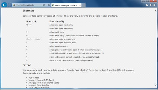 Met de muis door je feeds bladeren is niet altijd even handig als je er heel wat hebt. Gelukkig kent Selfoss heel wat sneltoetsen, die overigens erg lijken op die van Google Reader. Was je dus vroeger een verwoed gebruiker van Google Reader, dan zul je snel met Selfoss aan de slag kunnen. Zo selecteer en open je met de spatiebalk het volgende bericht, met S geef je het huidige bericht een ster of verwijder je die en met V open je de url van het bericht in een nieuw tabblad.