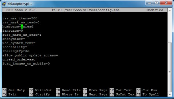 Ga daarna naar de map van Selfoss met de opdracht cd /var/www/selfoss/. In die map staat een configuratiebestand voor de webtoegang. Daar passen we iets in aan met de opdracht sudo nano .htaccess. Op een van de eerste regels van het bestand staat #RewriteBase /selfoss. Haal het hekje (#) aan het begin van de regel weg, sla op met Ctrl+O en sluit af met Ctrl+X. Daarna maken we het bestand met de instellingen voor Selfoss klaar door een standaardbestand te kopiëren: sudo cp defaults.ini config.ini. Open het met sudo nano config.ini om instellingen aan te passen.