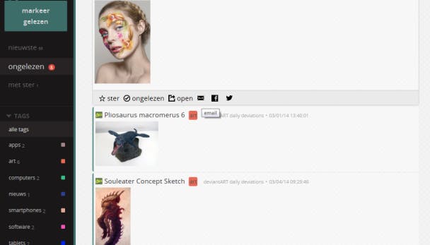 Wil je een bericht lezen, klik dan op de titel van het bericht om de samenvatting ervan te bekijken. Klik op de ster om het bericht bij je favorieten te plaatsen (bijvoorbeeld als je het later wilt lezen) en op openen om het bericht op de originele website te openen. Daarnaast staan ook enkele sociale-mediaknopjes, waarmee je het bericht deelt op Google+, Twitter, Facebook, Delicious of het naar iemand mailt of het in Pocket of Readability opslaat om later te lezen.