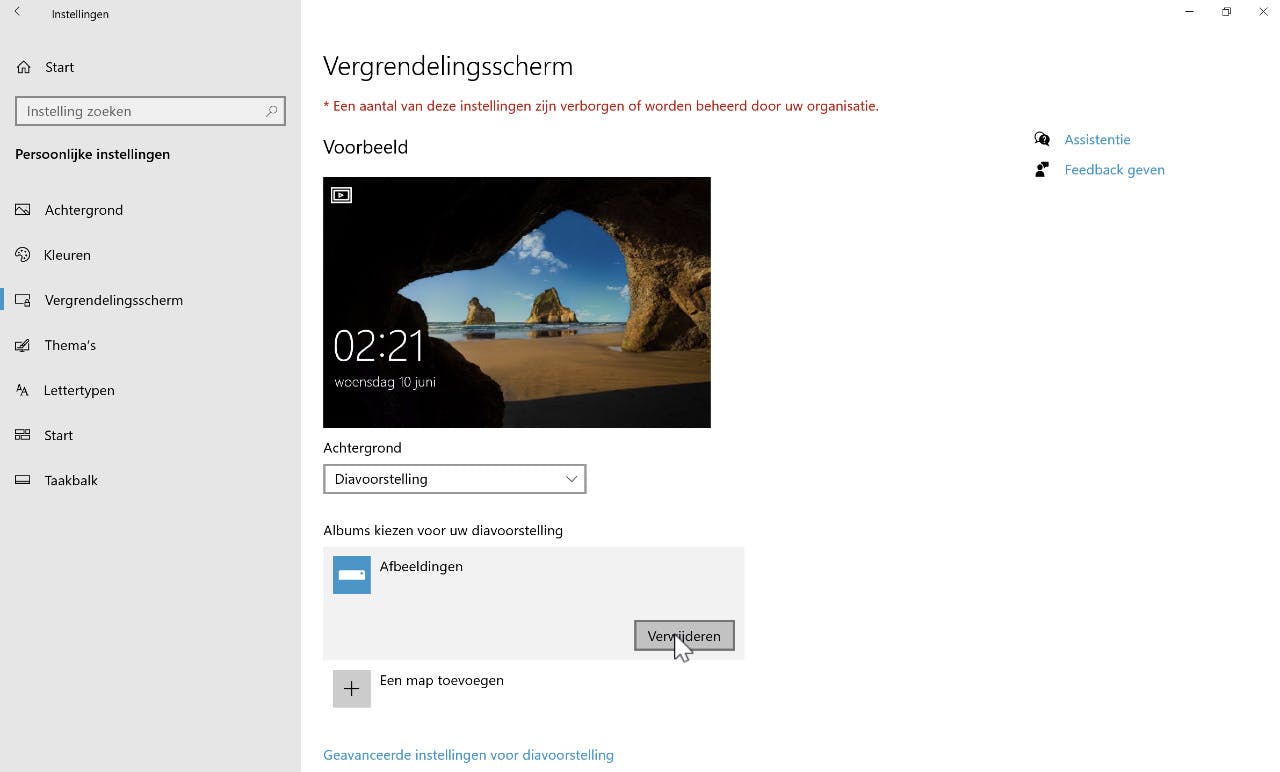Kun je niet kiezen, dan is er in het selectiemenu onder Achtergrond de optie Diavoorstelling. Standaard is de map Afbeeldingen geselecteerd als bron voor je show. Wellicht is het handiger om een aparte map met speciaal voor de achtergrond geselecteerde afbeeldingen te maken. Verwijder dan de map Afbeeldingen door hierop te klikken en dan op Verwijderen te klikken. Uiteraard verdwijnt hiermee niet de map van je schijf, maar alleen de bron voor de diashow. Klik vervolgens op Toevoegen, blader naar de map met je verzamelde achtergrondfoto’s en klik op de knop Deze map kiezen. Check ook de mogelijkheden onder de link Geavanceerde instellingen voor diavoorstelling even; de hier beschikbare opties met schakelaar spreken voor zichzelf.