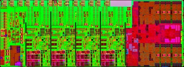 We kunnen duidelijk de vier processor-cores en de grafische core (rechts) onderscheiden.