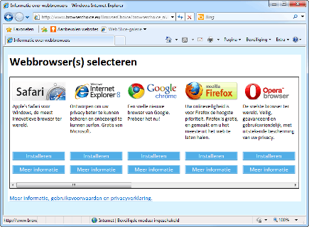 In het keuzescherm ziet u twee knoppen onder iedere browser. Met de knop Meer informatie kunt u informatie oproepen en via Installeren installeert u de browser. Het is raadzaam om eerst op Meer informatie te klikken, want daarmee komt u op een webpagina waarop wordt getoond welke functionaliteit de betreffende browser in huis heeft. In veel gevallen kunt u via die webpagina de browser ook direct downloaden en installeren.