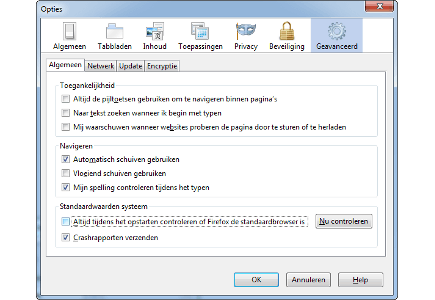 Als u bij de vorige tip op Cancel hebt geklikt, zal toch niet iedere browser zich storen aan het feit dat u hebt aangegeven dat u niet meer wilt worden lastiggevallen door het genoemde pop-upvenster. Krijgt u de melding nog steeds, controleer dan of u hem in de betreffende browser ergens bij Opties of Instellingen kunt uitschakelen. Bij Firefox doet u dat bijvoorbeeld door bij Extra / Opties / Geavanceerd de optie Altijd tijdens het opstarten controleren of Firefox de standaard browser is uit te vinken. In Google Chrome doet u dit via Aanpassen/Beheren / Basisinstellingen / Standaard browser en in Internet Explorer via Extra / Internetopties / Programma's / Standaardbrowser.