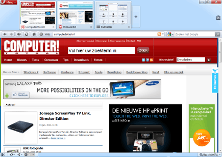 Uiteraard biedt Opera de mogelijkheid om meerdere webpagina's naast elkaar te openen. Met Ctrl+T opent u een nieuwe tab en in de adresbalk kunt u vervolgens de webpagina opgeven die u erin wilt openen. Als er meerdere pagina's zijn geopend, ziet u dus ook meerdere tabs. Zeker wanneer u een groot beeldscherm hebt, is het handig om daarbij gebruik te maken van Visual Tabs. Standaard toont Opera een miniatuur van de webpagina die schuilgaat achter een tab, zodra u uw muis erboven houdt. Standaard kunt u op die manier slechts één miniatuur tegelijk zien. Als u de miniaturen wilt zien van alle pagina's die openstaan, kunt u de tabruimte vergroten. Dit doet u door de muis op de rand onder de tabs te plaatsen en op de rechtermuisknop te drukken. Houd deze knop ingedrukt en sleep de rand naar beneden. Zodra er voldoende ruimte is, zal Opera van elke in een tab geopende webpagina een miniatuur tonen. Op die manier maakt u het eenvoudiger om tussen webpagina's te schakelen.