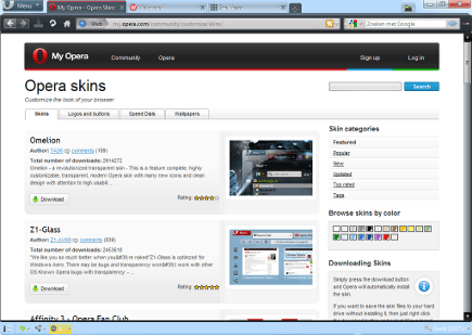 Opera ondersteunt het gebruik van skins, en daarvan zijn er al enorme aantallen gemaakt door enthousiaste gebruikers. Al deze skins kunt u gratis binnenhalen via Opera Skins. Kies een leuke skin uit en klik op Download. Als u dit doet terwijl u met Opera surft, wordt de skin direct geïnstalleerd.