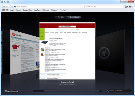 Sites die u eerder hebt bezocht, kunt u bij Safari op een fraaie manier terugvinden. Open het onderdeel Topsite en klik op Geschiedenis. Alle webpagina's die u eerder hebt bekeken, staan nu in een 3D-weergave naast elkaar. U kunt er met de muis doorheen bladeren en als u een site wilt openen, selecteert u hem door erop te klikken.