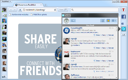 De overtreffende trap van sociale-netwerkbrowsers is Rockmelt. De ontwikkeling van deze browser verkeert nog in de testfase en de software is nog zó vers dat hij niet in het browserkeuzescherm van Windows is opgenomen. U vindt Rockmelt hier, en behalve een film waarin wordt uitgelegd wat de makers ermee van plan zijn is er alleen een knop te vinden waarmee via Facebook een account kan worden aangevraagd. Na het aanvragen van het account kan het enkele dagen duren voordat u een e-mailbericht krijgt, waarin de downloadlink staat waarmee u het installatiebestand van Rockmelt binnenhaalt.
