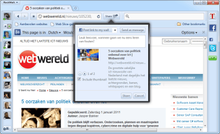 Door de integratie van de browser met sociale netwerken is het heel eenvoudig om vanuit Rockmelt informatie te delen met vrienden. Als u een artikel of webpagina in de browser hebt geopend, kunt u die via een klik op Share direct delen. Rockmelt opent daarbij een lijstje waarin de beschikbare sociale netwerken staan en biedt vervolgens de mogelijkheid om een beknopt commentaar toe te voegen. Als u daarna nogmaals op Share klikt, staat het bericht online.