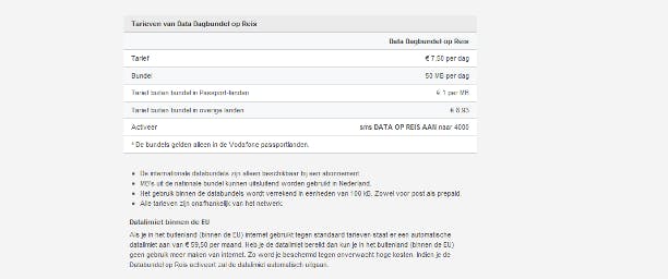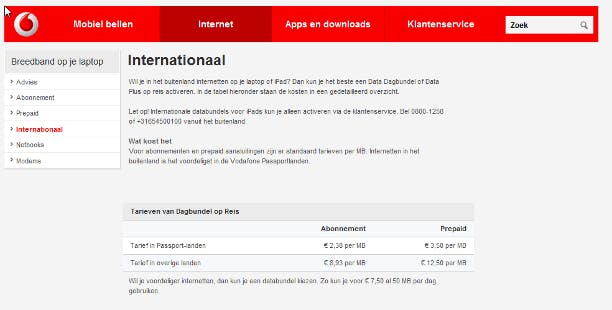 Mobiel internetten in het buitenland kan bij Vodafone een stuk voordeliger zijn, wanneer u een van de Vodafone Passport-landen bezoekt. Dit scheelt al snel 8 euro ten opzichte van niet-Passport landen. Daarnaast heeft Vodafone een bundel van 50 MB per dag, waarvoor u 7,50 euro per dag betaalt. Buiten deze bundel betaalt u 1 euro per MB in Passport-landen en 8,93 euro per MB in niet-Passport landen. Vodafone lijkt een van de weinige grote providers die prepaid mobiel internet in het buitenland toestaat.