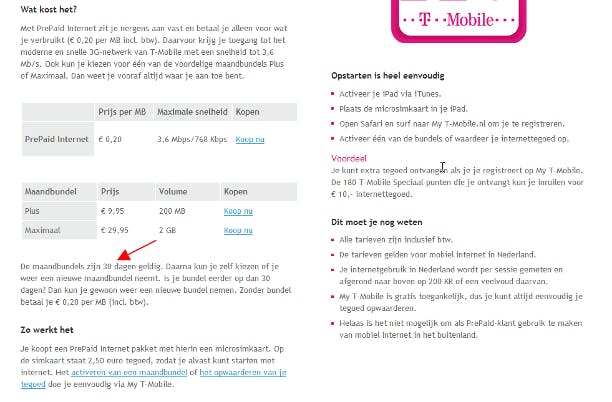 Voor mobiel internet gaat u pas betalen wanneer u het gebruikt, dus wanneer u gegevens over de lijn verzendt. De verbinding zelf kost in principe niets, ook niet in het buitenland. Natuurlijk is het wel belangrijk om te weten of u geen programma's hebt draaien die automatisch updaten via internet, anders zit u alsnog binnen de kortste keren aan uw limiet. Een limiet op de verbindingstijd is er echter niet. In tip 1 stippen we al even aan dat het nadeel van prepaidconstructies vaak is dat het tegoed na verloop van tijd niet meer geldig is. Prepaid heeft echter nog een ander nadeel. Namelijk: afhankelijk van de provider, verloopt niet alleen het tegoed na enige tijd, maar ook de geldigheid van de gehele sim. Zo kan het dus zijn dat een simkaart die u vorig jaar hebt aangeschaft voor mobiel internet, dit jaar onbruikbaar is geworden omdat u te lang geen tegoed hebt bijgestort. Het is enigszins begrijpelijk, want het is een manier voor providers om te voorkomen dat er miljoenen inactieve kaarten in omloop zijn, maar het maakt de drempel voor prepaid wel wat hoger.