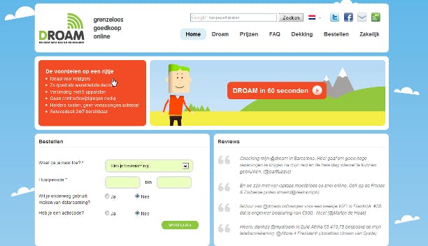 Er is nog een andere, zeer originele oplossing, in de vorm van DROAM. DROAM is een dienst die speciaal is ontwikkeld voor mensen die tijdelijk gebruik willen maken van internet in het buitenland, maar geen abonnement willen afsluiten of hoge bedragen willen betalen per MB. Wanneer u van plan bent om naar het buitenland te gaan, laat u DROAM via de site weten waar u heen gaat en voor hoe lang, waarna zij u een offerte sturen voor de genoemde periode, waarbij u een bundel krijgt van 50 MB per dag. U krijgt een apparaatje opgestuurd dat een 3G-signaal omzet in wifi, zodat u vijf apparaten tegelijkertijd van internet kunt voorzien in het buitenland. Op de site meldt DROAM dat u 27,50 euro betaalt voor de eerste dag, en daarna 3,50 euro voor elke dag dat u internet gebruikt. U betaalt alleen voor de dagen die u gebruikt. De bundel van 50 MB neemt u niet mee naar de volgende dag, dat is jammer. Maar u kunt ook niet per ongeluk over de bundel heen, want zodra u de limiet bereikt, wordt de verbinding verbroken. Wilt u meer dan 50 MB per dag? U kunt ook 1 GB kopen voor de gehele vakantieperiode, waarbij u niet vastzit aan een daglimiet. Voor de eerste GB betaalt u 65 euro, daarna 45 euro voor iedere extra GB. Na afloop stuurt u het apparaatje weer terug.
