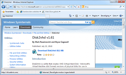 Professionals gebruiken vaak het programma Disk2vhd, als ze een bestaand systeem of een bestaande harde schijf willen virtualiseren. Disk2vhd is een programma van Sysinternals, een maker van handige hulpprogramma's die een paar jaar geleden door Microsoft werd opgekocht. Disk2vhd is gratis te downloaden via Disk2vhd. U krijgt het dan binnen in een zip-bestand dat u kunt uitpakken. U kunt het programma daarna direct opstarten, installeren is verder niet nodig.