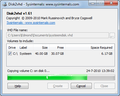 Met Disk2vhd kopieert u de inhoud van een heel systeem of van een harde schijf naar een vhd-bestand.