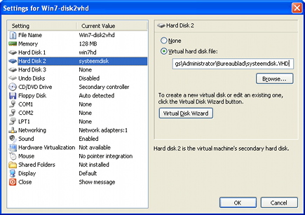 Binnen VirtualPC kunt u uw virtuele harde schijf ook gebruiken. Start VirtualPC en selecteer een bestaande virtuele machine. Kies voor Settings en selecteer bijvoorbeeld Hard Disk 2 om de virtuele harde schijf als tweede schijf in de pc te koppelen. Ga via Browse naar de virtuele harde schijf en selecteer het vhd-bestand. Bevestig met Openen, OK. Wanneer u nu de virtuele machine start, zal de tweede harde schijf er in Windows Verkenner zijn te vinden. Is dat niet het geval, dan moet u de schijf koppelen in Schijfbeheer. Klik met de rechtermuisknop op Deze Computer en kies Beheren. Onder Schijfbeheer ziet u een nog niet toegewezen disk. Die kunt u initialiseren of een stationsletter geven, waarna u de schijf kunt gebruiken alsof het een 'echte' is.