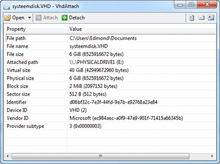 VHD Attach heeft ook een programmavenster. Dit is na de installatie terug te vinden via Start, Alle programma's, VHD Attach. Als u het opent, ziet u een leeg programmavenster, maar via Open kunt u een vhd-bestand selecteren. Het programma toont daarbij ook bestandsinformatie over de virtuele schijf, zoals de virtuele grootte, de werkelijke grootte en de naam. Via Attach en Detach kunt u ook hier eenvoudig schijven koppelen. Bovendien laat het venster via Attached Path altijd zien met welke stationsletter de virtuele schijf kan worden teruggevonden in Windows Verkenner.
