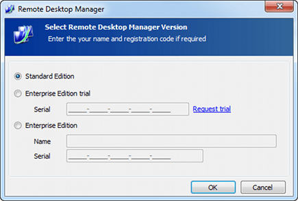 Van Remote Desktop Manager is zowel een betaalde als een gratis versie beschikbaar. De betaalde versie is alleen interessant voor bedrijven. Daarmee is het bijvoorbeeld mogelijk om alle inloggegevens, zoals gebruikersnamen en wachtwoorden, centraal in een database te bewaren. Zelfs de netwerkbeheerder hoeft die dan niet te weten. Voor thuisgebruik is de gratis standaardversie uitgebreid genoeg. Ga naar Remotedesktopmanager, klik op Download en daarna op Download the binaries here. Na de installatie wordt het programma gestart. Kies Standard Edition en bevestig met OK.