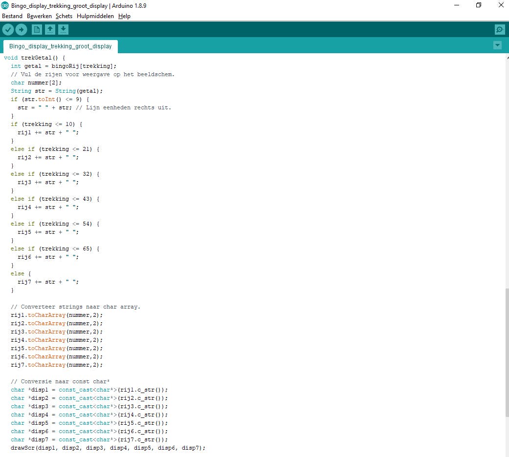 De functie trekGetal is waar de magie gebeurt, dus daar blijven we wat langer bij stilstaan. We nemen een getal uit bingoRij op plaats trekking. Die variabele heeft in het begin als waarde 0, waardoor we het eerste getal uit de rij nemen. In het eerste deel van de functie schrijven we het getal naar het oled-scherm, waarbij er telkens elf getallen op elke rij passen. De getrokken getallen worden eerst omgezet naar losse tekens en vervolgens verwerkt door de functie drawScr, die op zijn beurt gebruikmaakt van de bibliotheek U8glib.h.