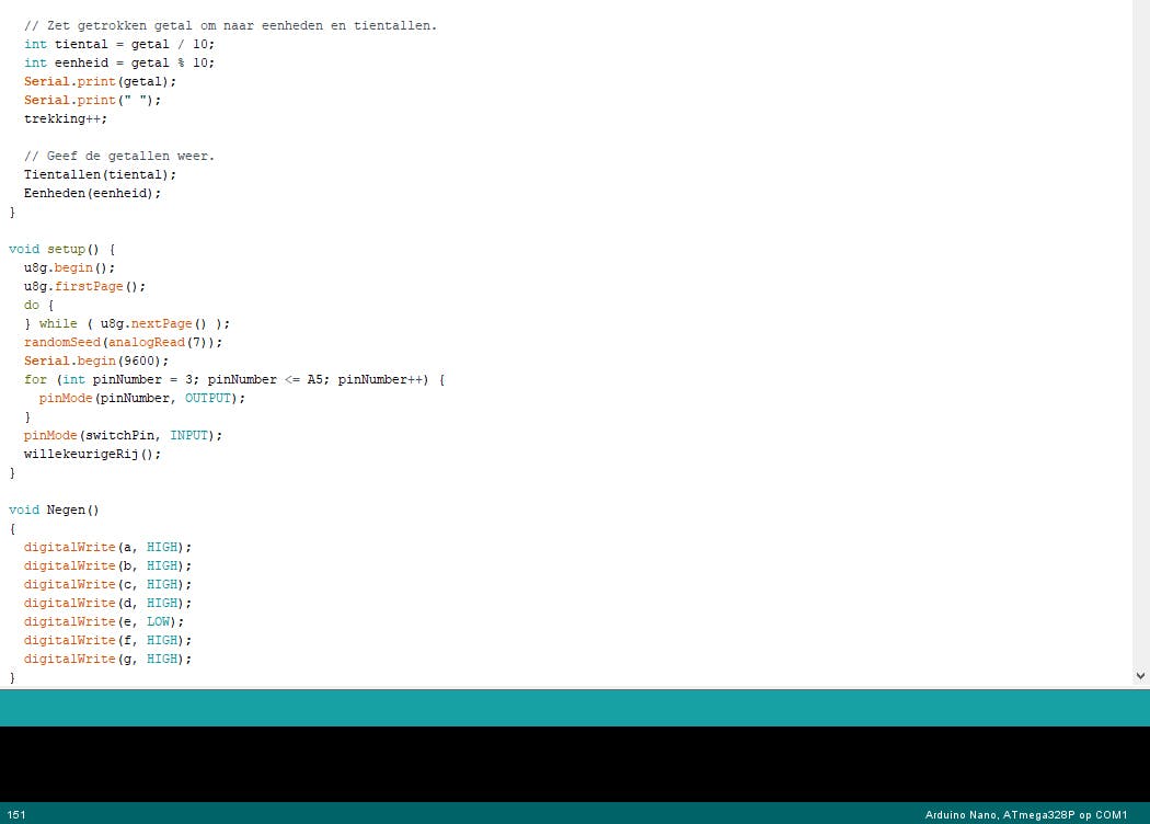 Het schrijven van het getal naar de 7-segmentdisplays gaat iets anders. We delen het getal door 10 en kennen dit toe aan de variabele tiental. Omdat dit een getal van type int is, gaat het om een gehele deling, dus zonder komma. Daardoor bevat tiental het eerste cijfer van het getrokken getal, namelijk het tiental. Het tweede cijfer verkrijgen we door de rest van getal bij deling door 10 te berekenen, en dat doen we met getal % 10. Het %-teken berekent namelijk die rest. Daarna tellen we 1 bij de variabele trekking op, zodat we bij de volgende trekking het volgende getal nemen. Daarna roepen we de functies Tientallen en Eenheden aan met de variabelen tiental en eenheid om de juiste leds in te schakelen. Voor elk weer te geven cijfer is een aparte functie beschikbaar.